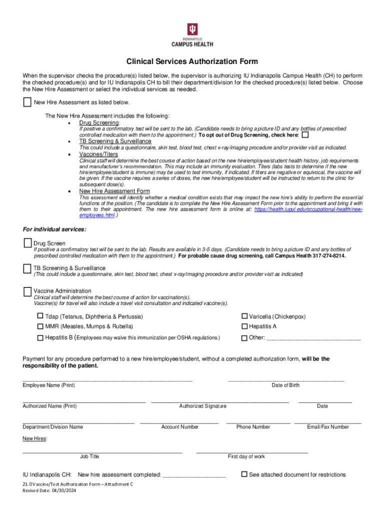 Clinical Services Authorization Form When the supervisor checks the procedure(s) listed below, the supervisor is authorizing IU Indianapolis Campus Health (CH) to perform the checked procedure(s)
