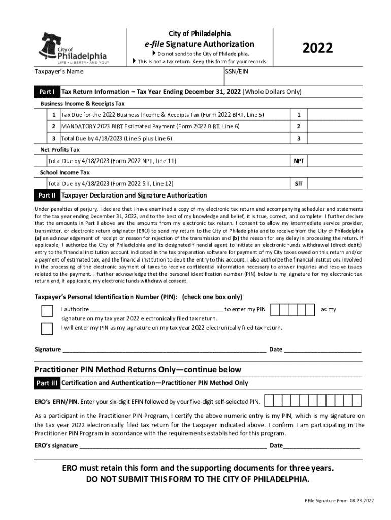 City of Philadelphiaefile Signature Authorization2022Do not send to the City of Philadelphia. This is not a tax return. Keep this form for your records. Taxpayers NameSSN/EINPart I Tax Return Information