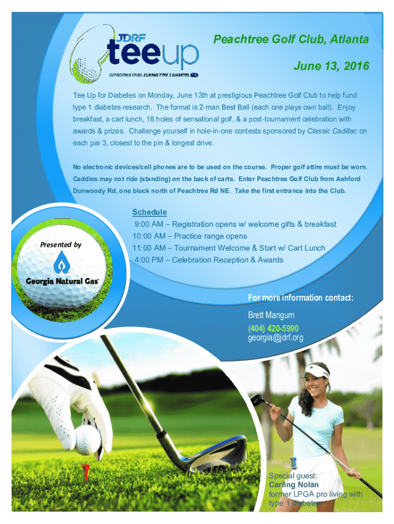 Peach tree Golf Club, Atlanta June 13, 2016, Tee Up for Diabetes on Monday, June 13th at prestigious Peach tree Golf Club to help fund type 1 diabetes research. The format is 2man Best Ball (each