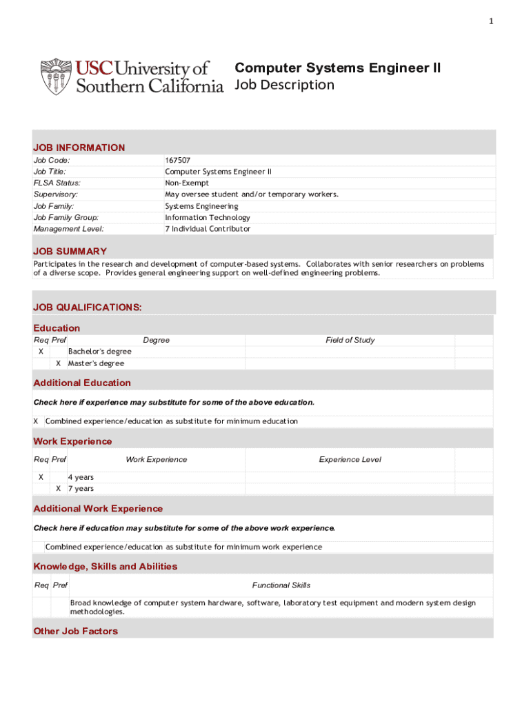 1Computer Systems Engineer II Job Description INFORMATION Job Code:167507Job Title:Computer Systems Engineer IIF LSA Status:NonExemptSupervisory:May oversee student and/or temporary workers. Job Family:Systems