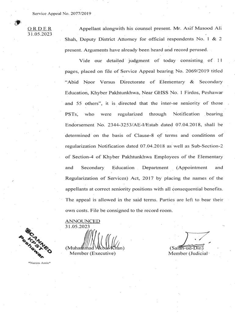 Service Appeal No. 2077/2019If\' Appellant along with his counsel present. Mr. Asif Mascot Order 31.05.2023Shah, Deputy District Attorney for official respondents No. 1 & 2 present. Arguments have