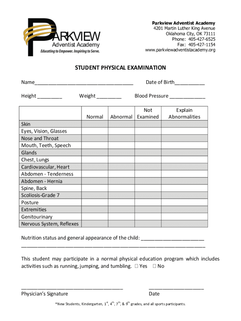 Parkview Adventist Academy 4201 Martin Luther King Avenue Oklahoma City, OK 73111 Phone: 4054276525 Fax: 4054271154 www.parkviewadventistacademy.orgSTUDENT PHYSICAL EXAMINATION Name___ Height ___Weight