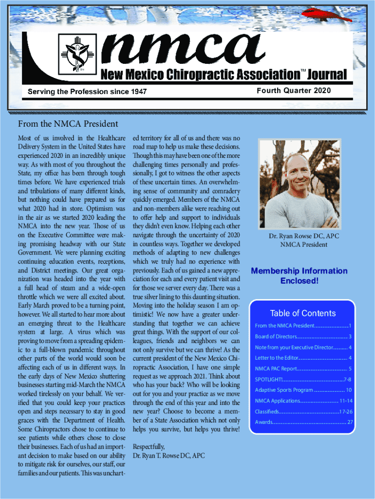Fourth Quarter 2020From the NMCA President Most of us involved in the Healthcare Delivery System in the United States have experienced 2020 in an incredibly unique way. As with most of you throughout