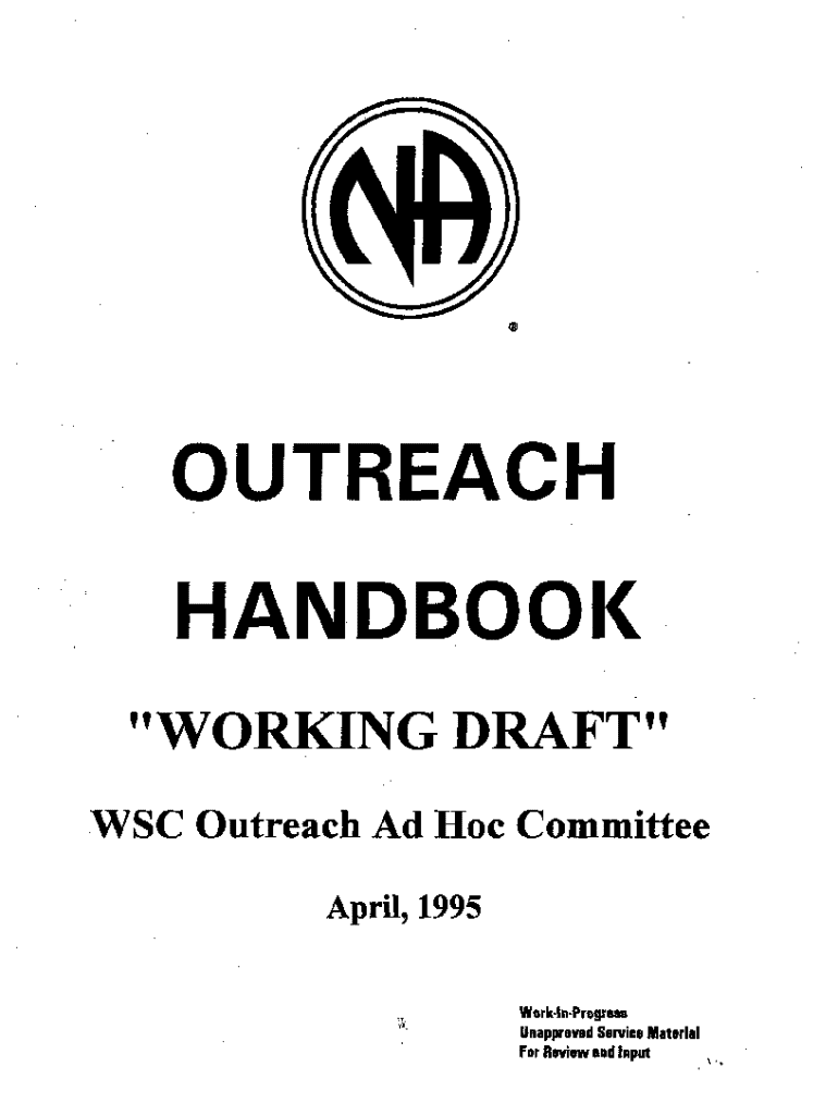 OUTREACH HANDBOOK \'\'WORKING DRAFT\'\' WSC Outreach Ad Hoc Committee April 1995 WorkInProgress Unapproved Service Material For Review and Input \'.THE WE\'VB Steps OF NARCOTICS ANONYMOUS1. We admitted