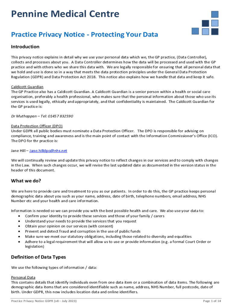 Pennine Medical Centre Practice Privacy Notice Protecting Your Data Introduction This privacy notice explains in detail why we use your personal data which we, the GP practice, (Data Controller),