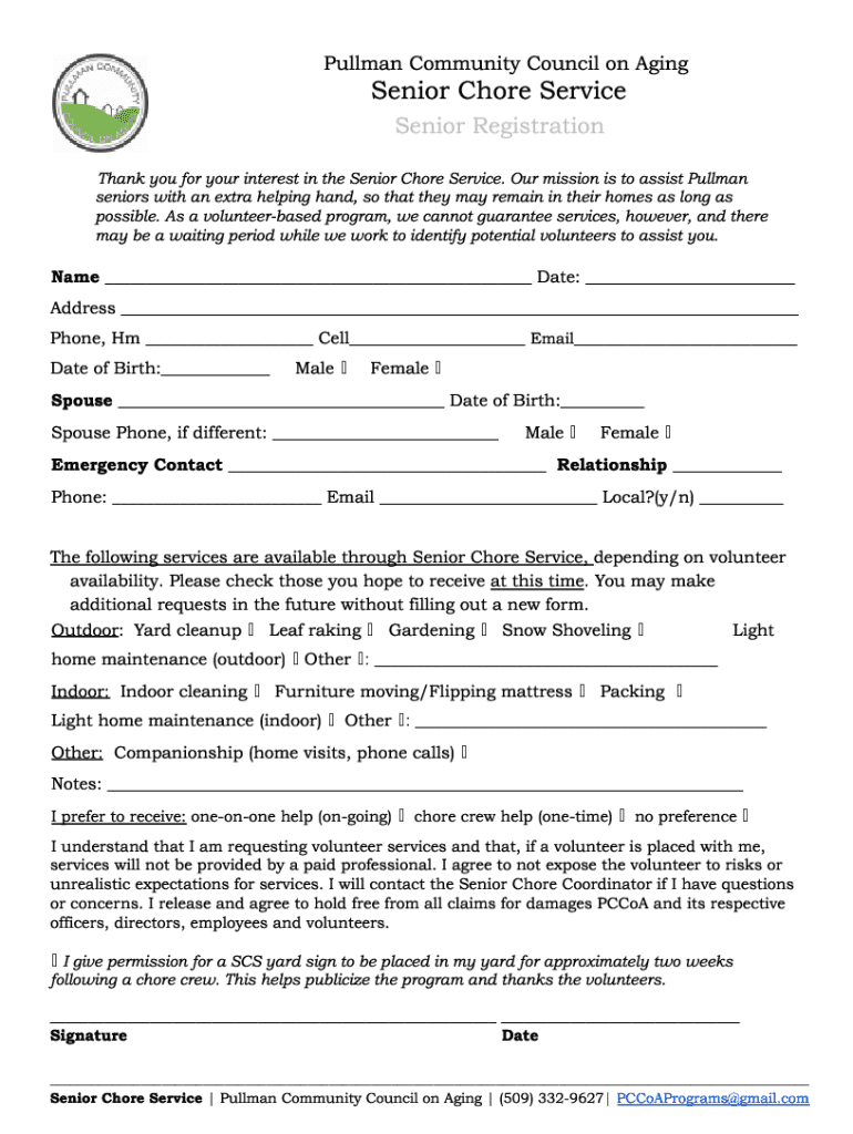Pullman Community Council on AgingSenior Chore Service Senior RegistrationThank you for your interest in the Senior Chore Service. Our mission is to assist Pullman seniors with an extra helping hand,