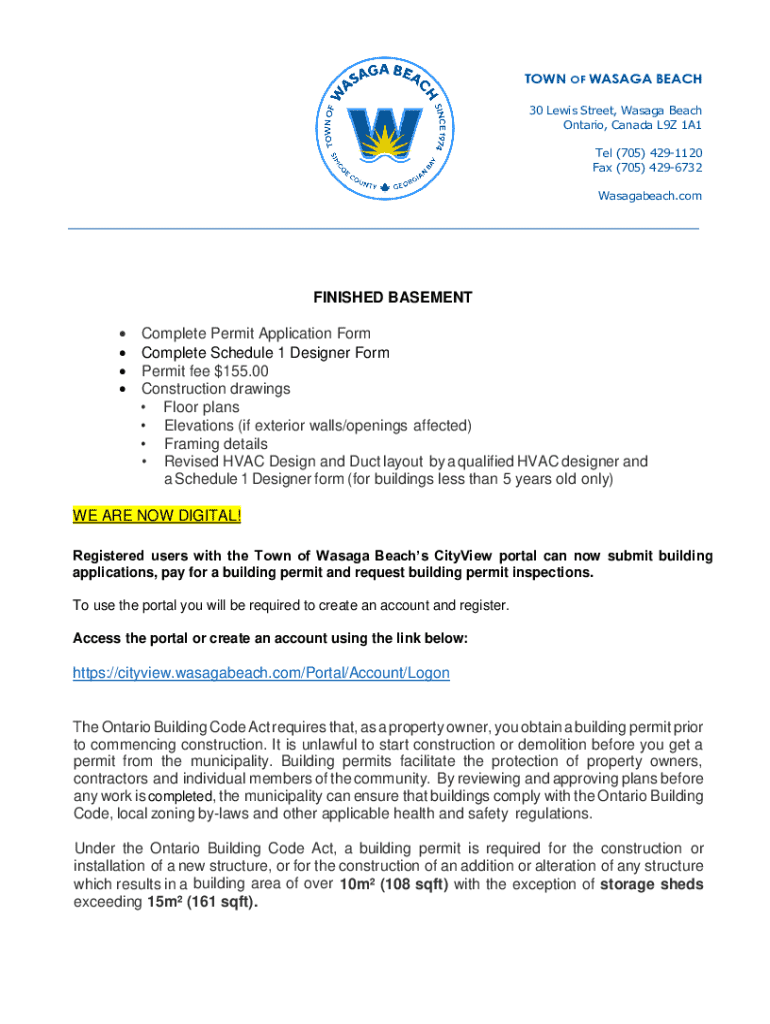 TOWN OF WASAGA BEACH 30 Lewis Street, Wasaga Beach Ontario, Canada L9Z 1A1 Tel (705) 4291120 Fax (705) 4296732 Wasagabeach.comFINISHED BASEMENT Complete Permit Application Form Complete Schedule 1