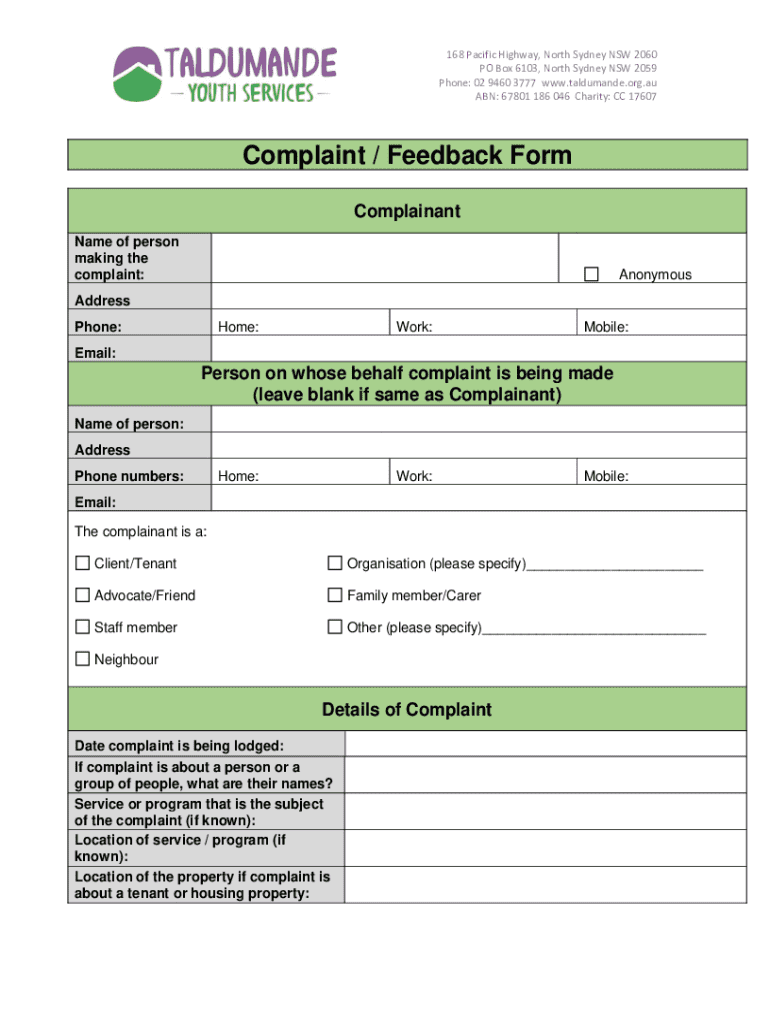 168 Pacific Highway, North Sydney NSW 2060 PO Box 6103, North Sydney NSW 2059 Phone: 02 9460 3777 www.taldumande.org.au ABN: 67801 186 046 Charity: CC 17607Complaint / Feedback Form Complainant Name