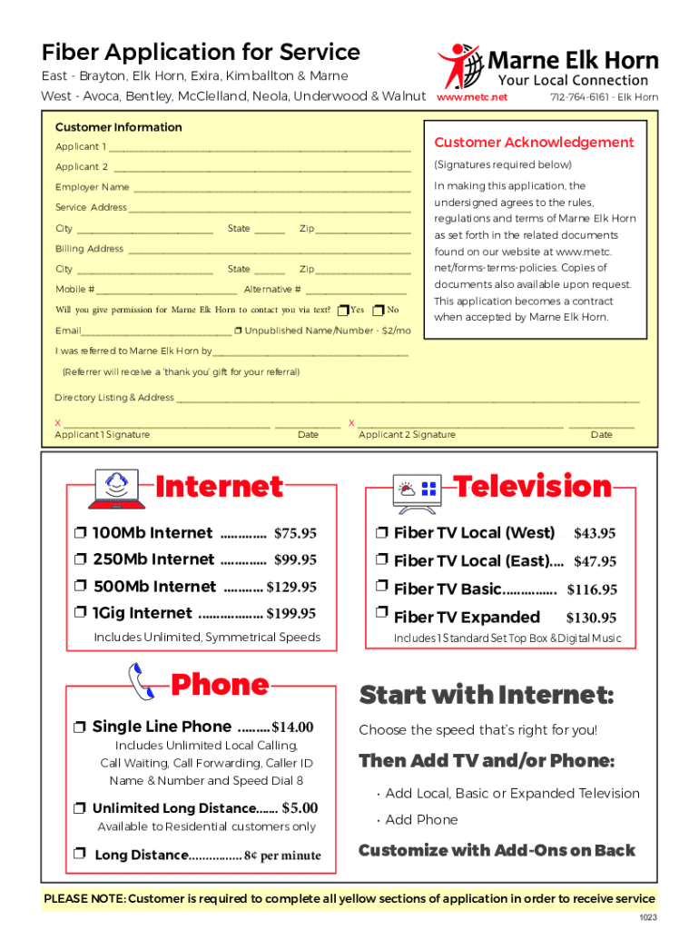 This document contains an application form for fiber service from Marne Elk Horn. It includes customer information fields, pricing for internet, television, and phone services, add-ons for tech support, TV boxes, premium channels, phone features, and maintenance. It also covers billing information, auto payments, and terms and conditions for service. The document provides detailed instructions for completing the application and information about fees, installation, and equipment return policies.