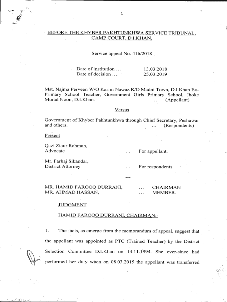1S/.\'BEFORE THE KHYBER PAKHTUNKHWA SERVICE TRIBUNAL. CAMP COURT. D.KHAN, Service appeal No. 416/2018Date of institution ... Date of decision ....13.03.2018 25.03.2019, MST. Name Preen W/0 Karim Away