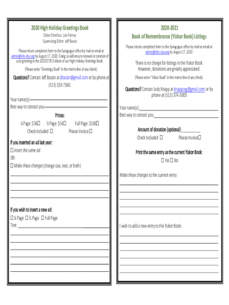 2020 High Holiday Greetings Book Editor Emeritus: Lois Porno Supervising Editor: Jeff BassinPlease return completed form to the Synagogue office by mail or email at admin@nhscba.org by August 17,