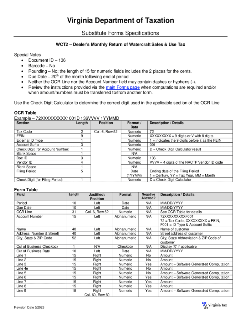 Specifications for the WCT2 form used by the Virginia Department of Taxation for reporting watercraft sales & use tax on a monthly basis.