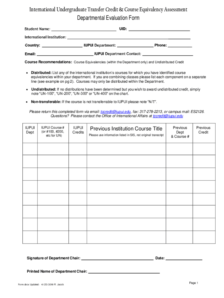 International Undergraduate Transfer Credit & Course Equivalency Assessment Departmental Evaluation FormCourse Recommendations: Course Equivalencies (within the Department only) and Undistributed