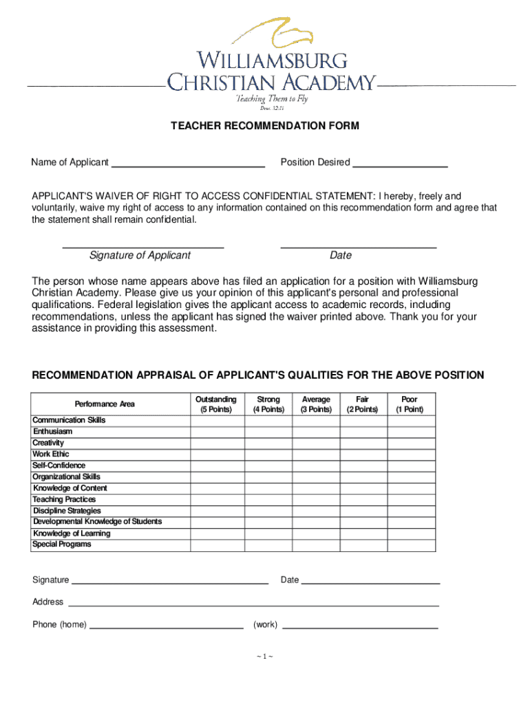 TEACHER RECOMMENDATION Forename of ApplicantPosition DesiredAPPLICANT\'S WAIVER OF RIGHT TO ACCESS CONFIDENTIAL STATEMENT: I hereby, freely and voluntarily, waive my right of access to any information