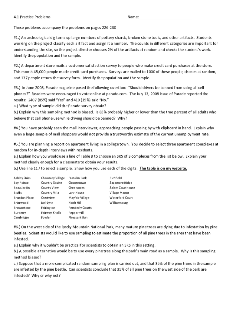 4.1 Practice ProblemsName: ___These problems accompany the problems on pages 226230 #1.) An archeological dig turns up large numbers of pottery shards, broken stone tools, and other artifacts. Students