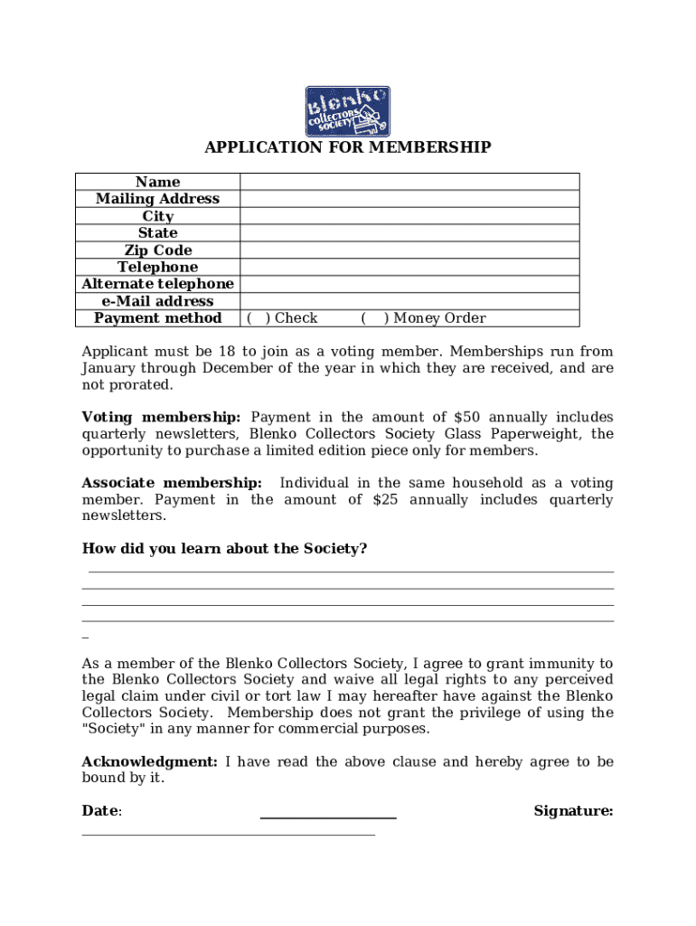 The BLENKO COLLECTORS SOCIETY is a document that has to be filled-out and signed for specific reasons. In that case, it is provided to the relevant addressee to provide certain info of certain kinds. The completion and signing may be done in hard copy or via an appropriate application e. g. PDFfiller. Such services help to complete any PDF or Word file online. It also lets you customize it according to your needs and put an official legal electronic signature. Once finished, the user sends the BLENKO COLLECTORS SOCIETY to the respective recipient or several ones by email and even fax. PDFfiller has a feature and options that make your document of MS Word extension printable. It includes a variety of settings for printing out appearance. No matter, how you send a document - physically or electronically - it will always look neat and firm. To not to create a new document from scratch again and again, turn the original form as a template. Later, you will have a customizable sample.