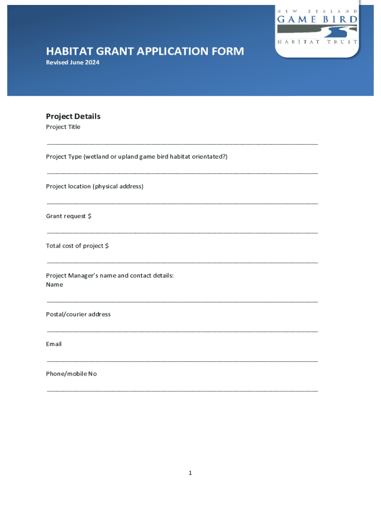 HABITAT GRANT APPLICATION FORM Revised June 2024Project Details Project Title ___Project Type (wetland or upland game bird habitat orientated?) ___Project location (physical address) ___Grant request