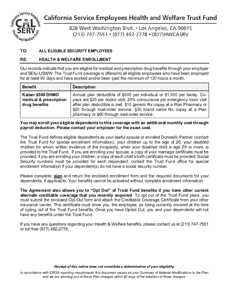 TO:ALL ELIGIBLE SECURITY EMPLOYEE SRE:HEALTH & WELFARE Enrollment records indicate that you are eligible for medical and prescription drug benefits through your employer