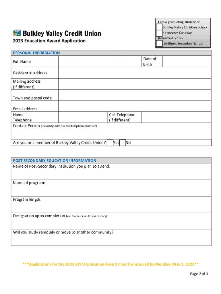 2023 Education Award ApplicationBulkley Valley Credit Union strongly supports students who are striving to reach their full potential by pursuing educational opportunities. We understand that there
