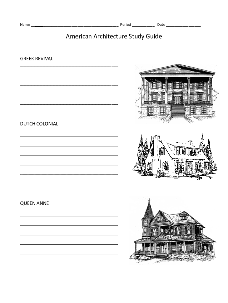 Name ___ Period ___ Date ___American Architecture Study Guide GREEK REVIVAL ___ ___ ___ ___ ___DUTCH COLONIAL ___ ___ ___ ___ ___QUEEN ANNE ___ ___ ___ ___ ___GOTHIC ___ ___ ___ ___ ___RANCH ___ ___
