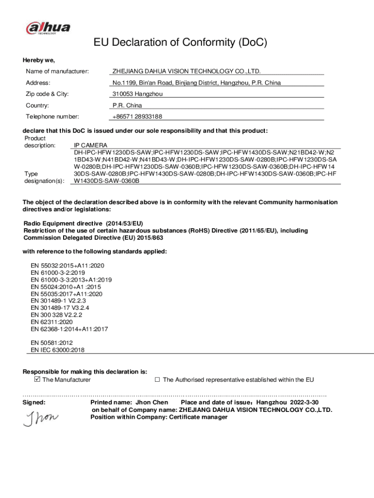 EU Declaration of Conformity (Doc) Hereby we, Name of manufacturer:ZHEJIANG DATA VISION TECHNOLOGY CO., LTD. Address:No.1199, Bin\'a Road, Xinjiang District, Hangzhou, P.R. China code & City:310053