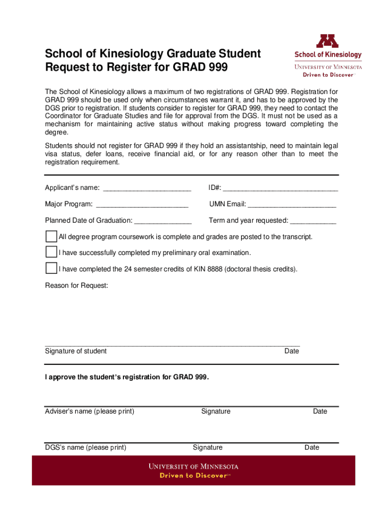 School of Kinesiology Graduate Student Request to Register for GRAD 999 The School of Kinesiology allows a maximum of two registrations of GRAD 999. Registration for GRAD 999 should be used only when