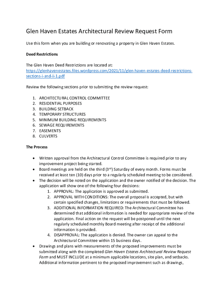 Glen Haven Estates Architectural Review Request Form Use this form when you are building or renovating a property in Glen Haven Estates. Deed Restrictions The Glen Haven Deed Restrictions are located
