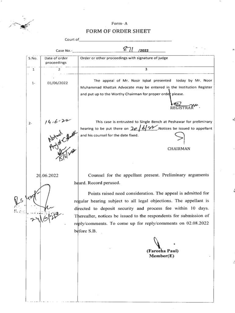 \'IForm AFORM OF ORDER SHEET Court of^7/Case No.Date of order proceedingsS.No.Order or other proceedings with signature of judge 321101/06/2022.f/2022The appeal of Mr. Nasir Iqbal presentedtoday by