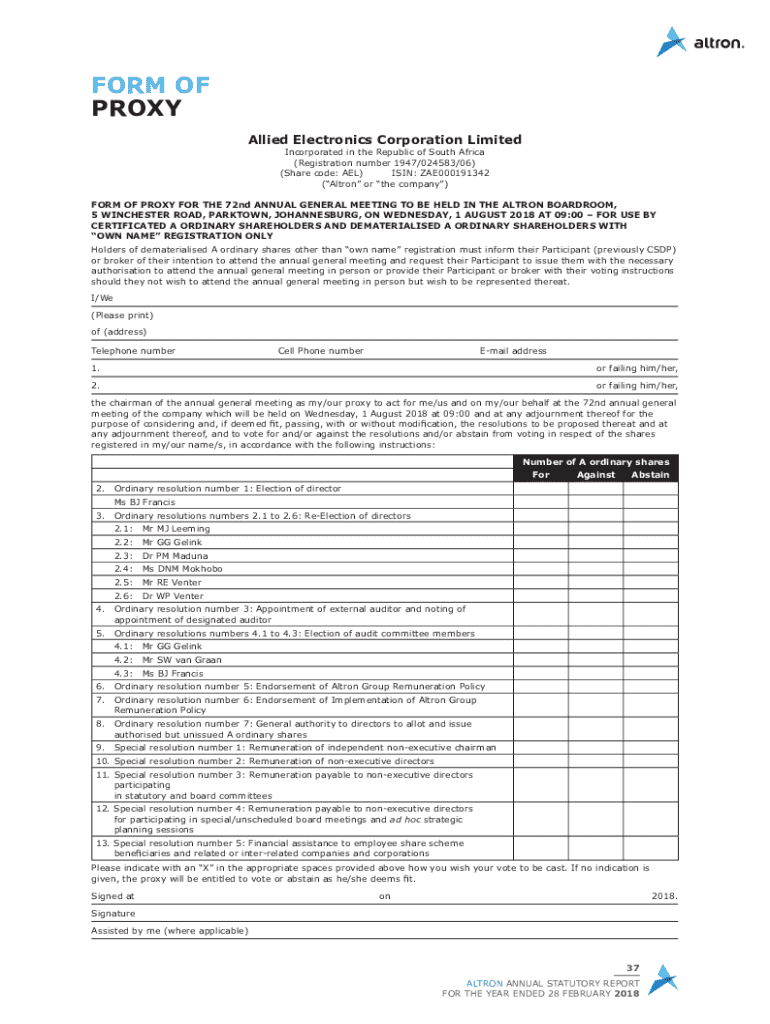 FORM OF PROXY Allied Electronics Corporation Limited Incorporated in the Republic of South Africa (Registration number 1947/024583/06) (Share code: AEL) ISIN: ZAE000191342 (Altron or the company)FORM