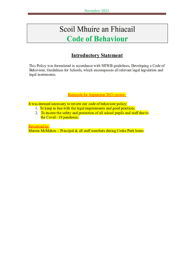 Introductory Statement This Policy was formulated in accordance with NEWB guidelines, Developing a Code of Behaviour, Guidelines for Schools, which encompasses all relevant legal legislation and legal