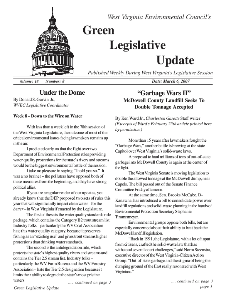 West Virginia Environmental Council\'sGreen Legislative Update Published Weekly During West Virginia\'s Legislative Session Volume: 18Number: 8Under the Dome By Donald S. Garvin, Jr., WVEC Legislative