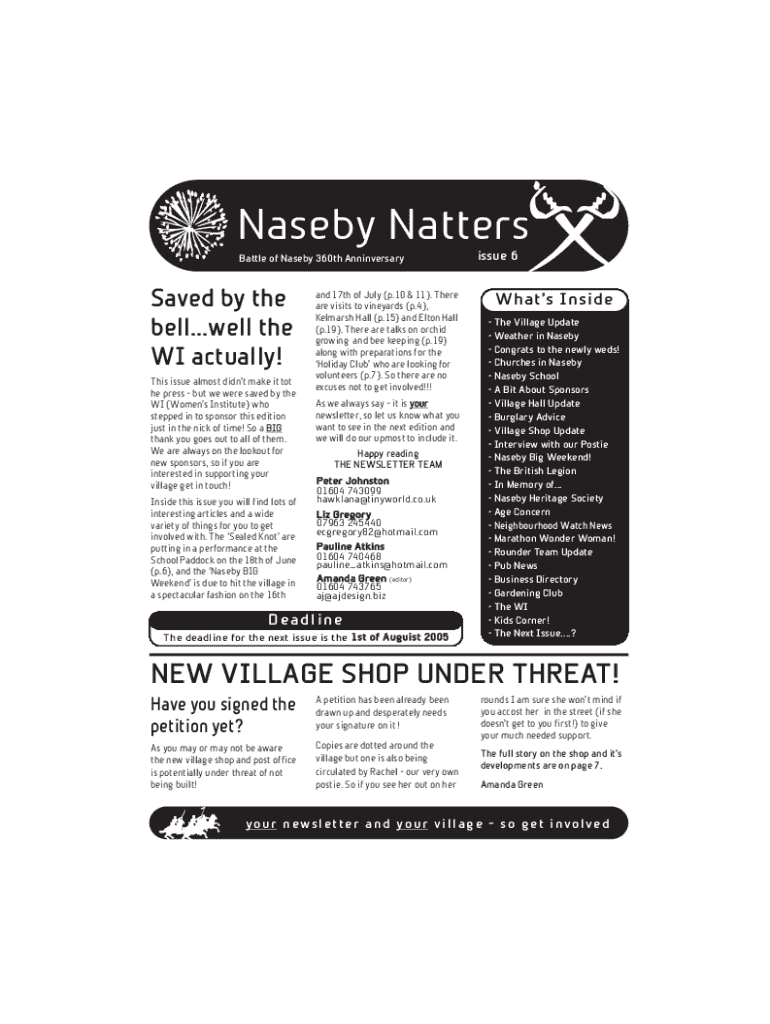 Natters 68/6/0502:08 pmPage 1Naseby Natters Battle of Naseby 360th AnninversarySaved by the bell...well the WI actually! This issue almost didnt make it tot he press but we were saved by the WI (Womens