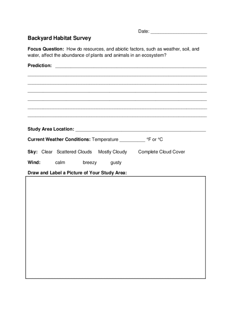 Date: ___Backyard Habitat Survey Focus Question: How do resources, and abiotic factors, such as weather, soil, and water, affect the abundance of plants and animals in an ecosystem? Prediction: ___