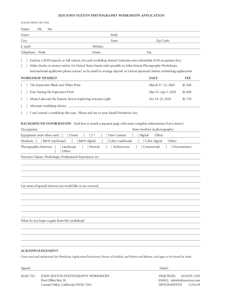 APPLICATION PROCEDURES To apply for the workshop(s) of your choice, please complete and sign the application form provided in this brochure. Return it with a deposit of $250 for each workshop. The