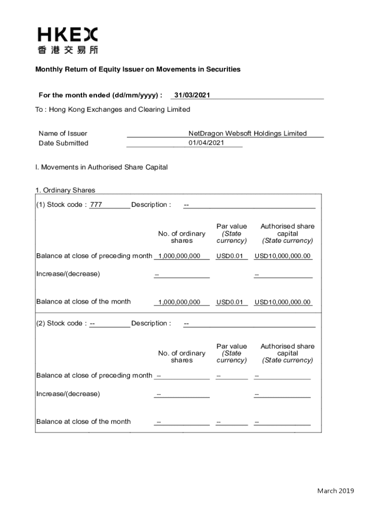 Monthly Return of Equity Issuer on Movements in Securities the month ended (dd/mm/YYY) :31/03/2021To : Hong Kong Exchanges and Clearing Limited Name of Issuer Date SubmittedNetDragon Web soft Holdings