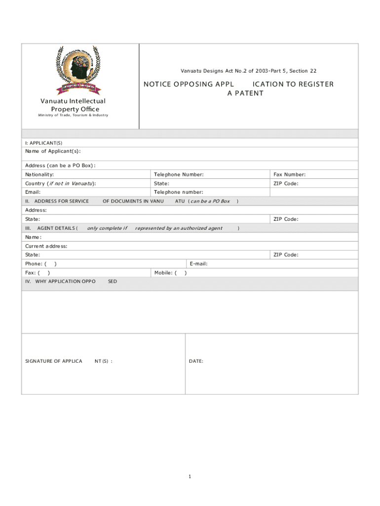 Vanuatu Designs Act No.2 of 2003 Part 5, Section 22NOTICE OPPOSING APPL ICATION TO REGISTER A PATENTVanuatu Intellectual Property OfficeMinistry of Trade, Tourism & Indus tryI: APPLICANT(S) Name of