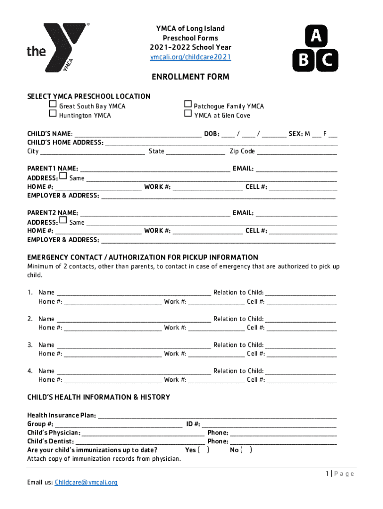 YMCA of Long Island Preschool Forms 20212022 School Year ymcali.org/childcare2021ENROLLMENT FORM SELECT YMCA PRESCHOOL LOCATION Great South Bay YMCA Huntington YMCAPatchogue Family YMCA at Glen Lovechild