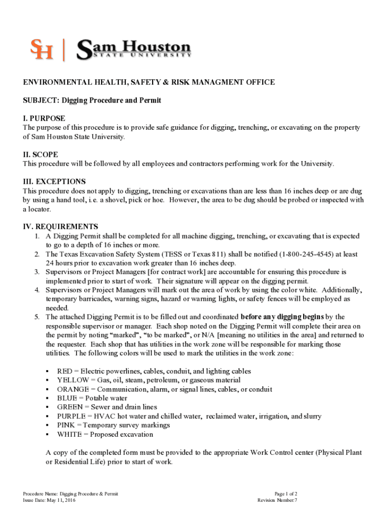 ENVIRONMENTAL HEALTH, SAFETY & RISK MANAGEMENT OFFICE SUBJECT: Digging Procedure and Permit I. PURPOSE The purpose of this procedure is to provide safe guidance for digging, trenching, or excavating