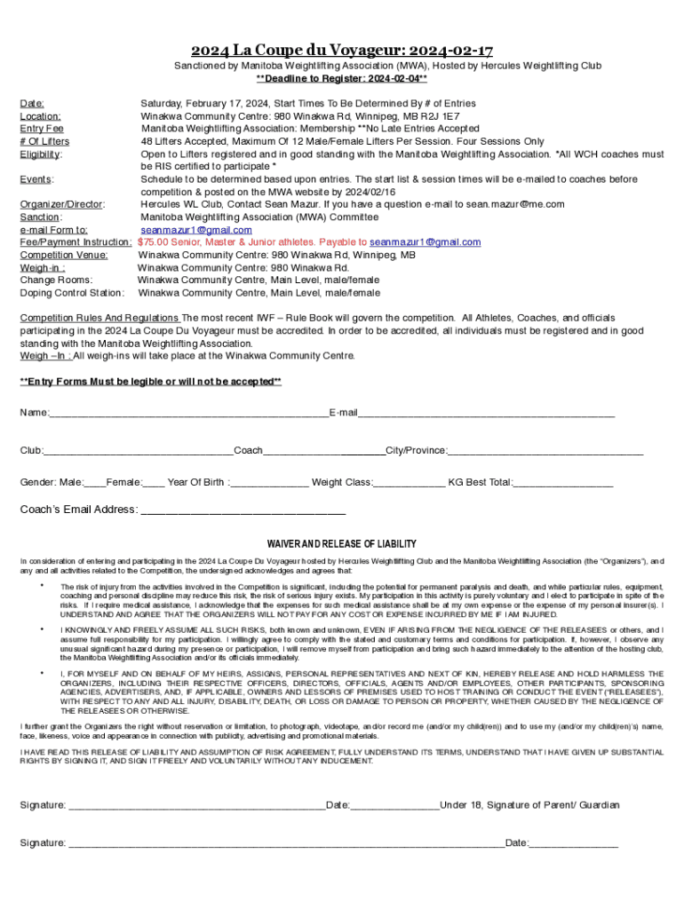 2024 La Coupe du Voyageur: 20240217 Sanctioned by Manitoba Weightlifting Association (MWA), Hosted by Hercules Weightlifting Club **Deadline to Register: 20240204** Date: Location: Entry Fee # Of
