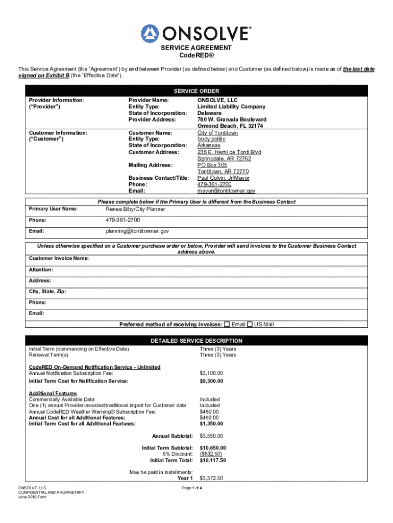 SERVICE AGREEMENT Covered This Service Agreement (the Agreement) by and between Provider (as defined below) and Customer (as defined below) is made as of the last date signed on Exhibit B (the Effective