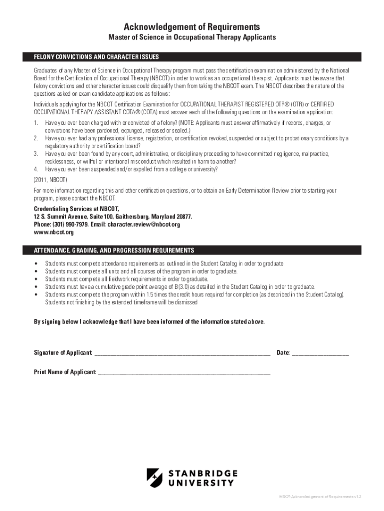 Acknowledgement of Requirements Master of Science in Occupational Therapy Applicants FELONY CONVICTIONS AND CHARACTER ISSUES Graduates of any Master of Science in Occupational Therapy program must