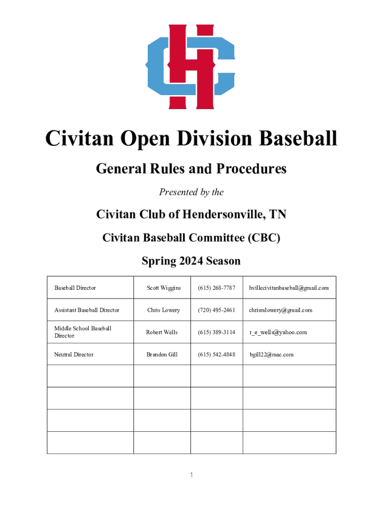 Civilian Open Division Baseball General Rules and Procedures Presented by theCivitan Club of Hendersonville, TN Civilian Baseball Committee (CBC) Spring 2024 Season Baseball Director Scott Wiggins(615)