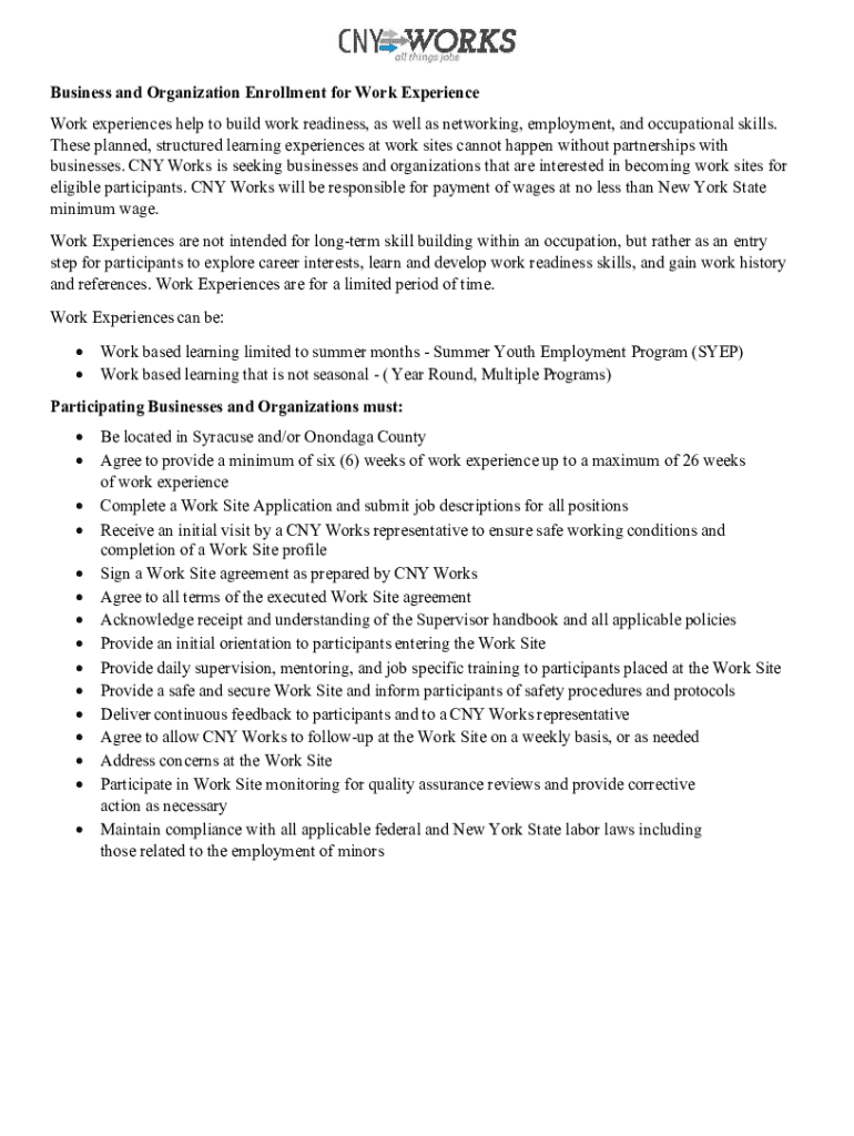 Business and Organization Enrollment for Work Experience Work experiences help to build work readiness, as well as networking, employment, and occupational skills. These planned, structured learning