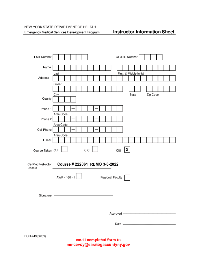 NEW YORK STATE DEPARTMENT OF HEATH Emergency Medical Services Development ProgramInstructor Information Sheet CLI/CIC Number EMT Cumbersome Nastiest & Middle InitialAddress StreetCityStateCountyPhone