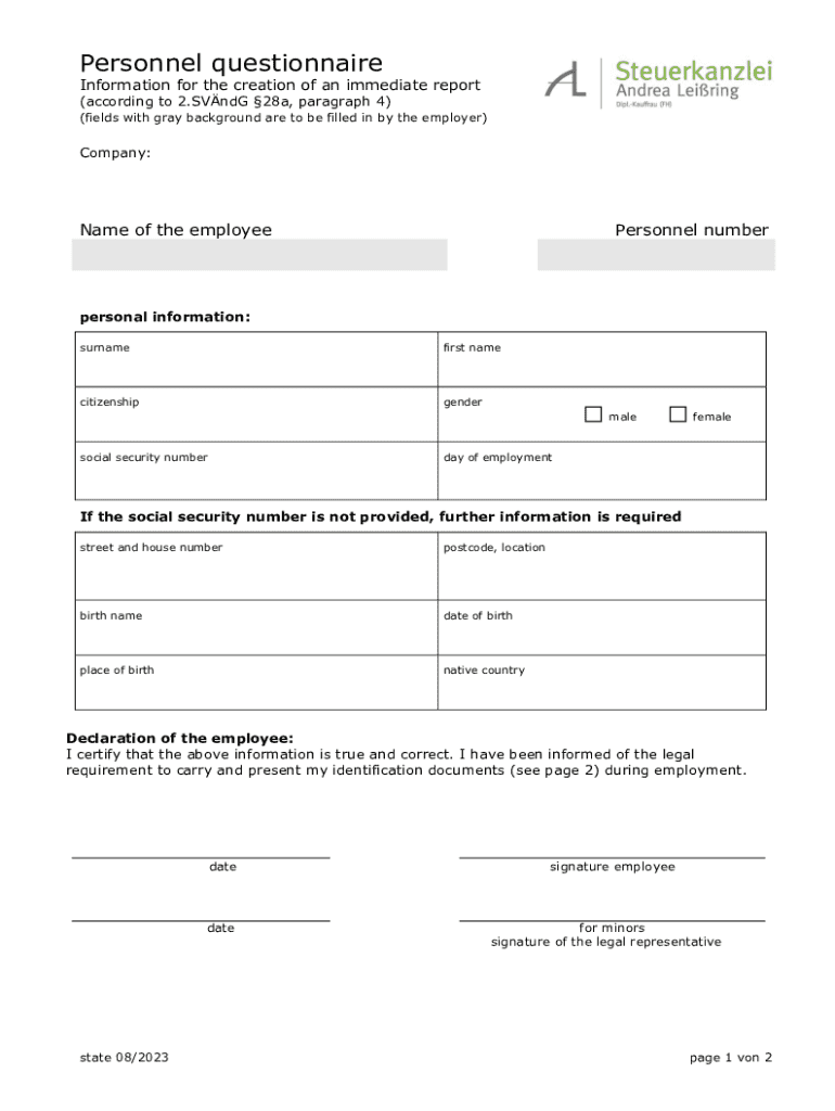 Personnel questionnaireInformation for the creation of an immediate report (according to 2.SVndG 28a, paragraph 4)(fields with gray background are to be filled in by the employer)Company:Name of the