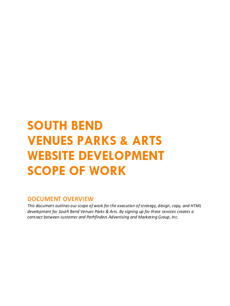 SOUTH BEND VENUES PARKS & ARTS WEBSITE DEVELOPMENT SCOPE OF WORK DOCUMENT OVERVIEW This document outlines our scope of work for the execution of strategy, design, copy, and HTML development for South