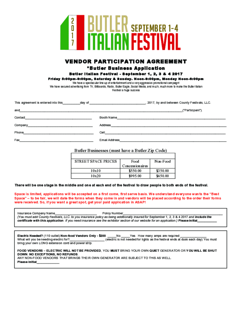 tler lian stival MBER 142 0 1 7Butler SEPTEMBER 14 Italian FestivalVENDOR PARTICIPATION AGREEMENT *Butler Business Application Butler Italian Festival September 1, 2, 3 & 4 2017 Friday 5:00pm9:00pm,