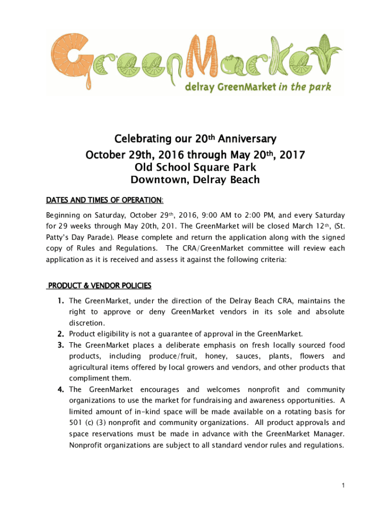 Celebrating our 20th Anniversary October 29th, 2016 through May 20th, 2017 Old School Square Park Downtown, Delray Beach DATES AND TIMES OF OPERATION: Beginning on Saturday, October 29th, 2016, 9:00