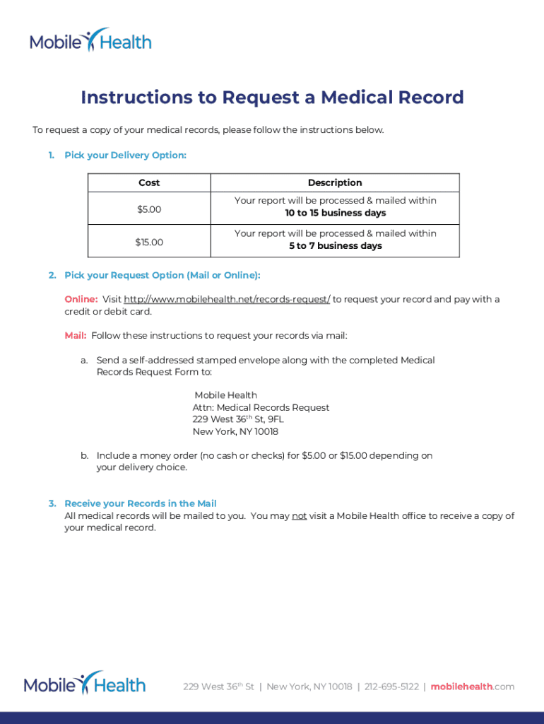 Instructions to Request a Medical Record To request a copy of your medical records, please follow the instructions below. 1. Pick your Delivery Option: CostDescription$5.00Your report will be processed