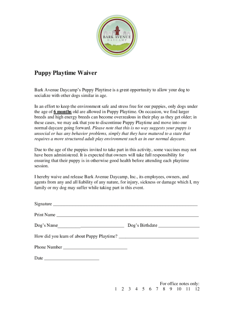 Puppy Playtime Waiver Bark Avenue Day camps Puppy Playtime is a great opportunity to allow your dog to socialize with other dogs similar in age. In an effort to keep the environment safe and stress-free